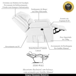 - Indicado para uso residencial, sua limpeza deve ser feita com pano umedecido em água limpa, sem esfregar, não utilizar produtos abrasivos, desengordurantes, álcool ou solvente. Nunca sentar nos braços ou encosto do produto.