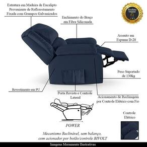 Diferenciais: Apoio de pés retrátil, Acompanha controle para acionamento e bolso lateral para revistas e livros