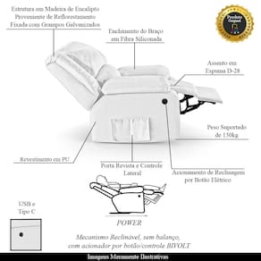 Diferenciais: Apoio de pés retrátil, Acompanha controle para acionamento e bolso lateral para revistas e livros