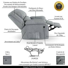 Que tal criar seu próprio home cinema? Aqui, vamos mostrar como você pode montar o seu! Com o local adequado, alguns itens decorativos e uma poltrona ideal, você garantirá um espaço confortável e imersivo. O primeiro passo é investir em equipamentos de alta qualidade! Olha só que lindeza a nossa Poltrona do Papai Reclinável Melim. Ela foi projetada para proporcionar máximo conforto e funcionalidade, esta poltrona é a escolha ideal para quem busca relaxamento, estilo e uma experiência de cinema privada. A facilidade de ajuste com o botão elétrico permite que você encontre a posição perfeita com o toque de um botão com LED, pensado para proporcionar uma experiência imersiva sem igual. A presença do botão elétrico e do controle de massagem eleva o nível de relaxamento, proporcionando uma experiência cinematográfica aliada aos benefícios terapêuticos de uma massagem. Com capacidade para suportar até 130 kg, oferecendo segurança e estabilidade ao consumidor. O revestimento em Linho Cinza oferece um toque de sofisticação e conforto, enquanto a estrutura em Madeira de Lei Eucalipto com Controle de Umidade, Proveniente de Reflorestamento, Fixa com Grampos Galvanizados garante resistência e durabilidade. O assento foi preenchido com fibra siliconada com espuma D-28, respectivamente, para um conforto adicional. O assento (fixo) e o apoio de Pés Retrátil proporcionam um apoio perfeito para suas pernas, aumentando o conforto. O encosto reclinável, possibilita ajustá- lo para a posição ideal de relaxamento. Já os pés fixos foram feitos em aço revestido com plástico, adicionando um toque de elegância ao produto. E tem mais!! Ela contém Bolso lateral para revistas e controle nas braças perfeito para armazenar livros e outros objetos, mantendo tudo ao seu alcance. Com um design moderno e prático, esta poltrona se tornará o destaque da sua sala de estar. Afinal, sua casa merece a Poltrona do Papai Reclinável Melim Elétrica LED Massagem. Adquira a sua agora mesmo e transforme sua sala de estar em um verdadeiro cinema!