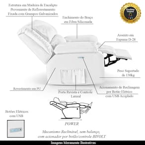 Diferenciais: Apoio de pés retrátil, com botão touch para acionamento e bolso lateral para revistas e livros