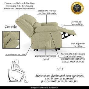 Diferenciais: Apoio de pés retrátil, acompanha controle para acionamento, elevação Lift, e bolso lateral para revistas e livros