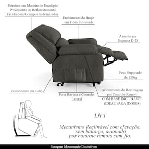 Diferenciais: Apoio de pés retrátil, acompanha controle para acionamento, elevação Lift, e bolso lateral para revistas e livros