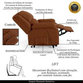 Diferenciais: Apoio de pés retrátil, acompanha controle para acionamento, elevação Lift, e bolso lateral para revistas e livros