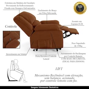 Diferenciais: Apoio de pés retrátil, acompanha controle para acionamento, elevação Lift, e bolso lateral para revistas e livros