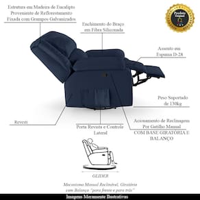 Diferenciais: Apoio de pés retrátil, poltrona giratória e balanço, acompanha controle para ativar massagem, gatilho lateral para acionar regulagem e bolso lateral para revistas e livros