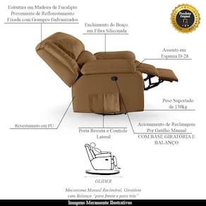 Diferenciais: Apoio de pés retrátil, poltrona giratória e balanço, acompanha controle para ativar massagem, gatilho lateral para acionar regulagem e bolso lateral para revistas e livros
