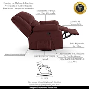 Que tal criar seu próprio home cinema? Aqui, vamos mostrar como você pode montar o seu! Com o local adequado, alguns itens decorativos e uma poltrona ideal, você garantirá um espaço confortável e imersivo. O primeiro passo é investir em equipamentos de alta qualidade! Olha só que lindeza a nossa Poltrona do Papai Reclinável Melim. Ela foi projetada para proporcionar máximo conforto e funcionalidade, esta poltrona é a escolha ideal para quem busca relaxamento, estilo e uma experiência de cinema privada. A poltrona contém sistema glider, acionamento reclinável elétrico por botão em uma das braças, encosto reclinável, apoio para os pés manual além disso ela é giratória com balanço suave perfeito para oferecer um relaxamento total. Este ajuste é feito manualmente, utilizando um gatilho localizado em uma das braças na lateral da poltrona. Ao puxar ou pressionar esse gatilho, o usuário pode reclinar o encosto ou levantar o apoio para os pés, ajustando a poltrona à posição desejada. Com capacidade para suportar até 130 kg, oferecendo segurança e estabilidade ao consumidor. O revestimento em Veludo oferece um toque de sofisticação e conforto, enquanto a estrutura em Madeira de Lei Eucalipto com Controle de Umidade, Proveniente de Reflorestamento, Fixa com Grampos Galvanizados garante resistência e durabilidade. O Assento/Encosto foi preenchido em Espuma D-28 e o braço foi preenchido com fibra siliconada, respectivamente, para um conforto adicional. O assento (fixo) e o apoio de Pés Retrátil proporcionam um apoio perfeito para suas pernas, aumentando o conforto. O encosto reclinável, possibilita ajustá- lo para a posição ideal de relaxamento. Já os pés giratório foram feitos em aço revestido com plástico, adicionando um toque de elegância ao produto. E tem mais!! Ela contém Bolso lateral para revistas e controle nas braças perfeito para armazenar livros e outros objetos, mantendo tudo ao seu alcance. Com um design moderno e prático, esta poltrona se tornará o destaque da sua sala de estar. Afinal, sua casa merece a Poltrona do Papai Reclinável Melim Glider Giratória. Adquira a sua agora mesmo e transforme sua sala de estar em um verdadeiro cinema!