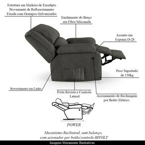 Que tal criar seu próprio home cinema? Aqui, vamos mostrar como você pode montar o seu! Com o local adequado, alguns itens decorativos e uma poltrona ideal, você garantirá um espaço confortável e imersivo. O primeiro passo é investir em equipamentos de alta qualidade! Olha só que lindeza a nossa Poltrona do Papai Reclinável Melim. Ela foi projetada para proporcionar máximo conforto e funcionalidade, esta poltrona é a escolha ideal para quem busca relaxamento, estilo e uma experiência de cinema privada. A praticidade do ajuste elétrico conta com acionamento de reclinagem por botão power elétrico Bivolt em uma das Braças, com apenas um toque, proporcionando a posição ideal, criando uma experiência incomparável. Com capacidade para suportar até 130 kg, oferecendo segurança e estabilidade ao consumidor. O revestimento em Linho Grafite oferece um toque de sofisticação e conforto, enquanto a estrutura em Madeira de Lei Eucalipto com Controle de Umidade, Proveniente de Reflorestamento, Fixa com Grampos Galvanizados garante resistência e durabilidade. O encosto e o assento são sustentados por percintas elásticas. O braço/assento possui Enchimento em Fibra Siliconada. O assento foi preenchido com espuma D-28, respectivamente, para um conforto adicional. O assento (fixo) e o apoio de Pés Retrátil proporcionam um apoio perfeito para suas pernas, aumentando o conforto. O encosto reclinável, possibilita ajustá- lo para a posição ideal de relaxamento. Já os pés (fixos) foram feitos em aço revestido com plástico, adicionando um toque de elegância ao produto. E tem mais!! Ela contém Bolso lateral nas braças perfeito para armazenar livros e revistas, mantendo tudo ao seu alcance. Com um design moderno e prático, esta poltrona se tornará o destaque da sua sala de estar. Afinal, sua casa merece a Poltrona do Papai Reclinável Melim Power Elétrica. Adquira a sua agora mesmo e transforme sua sala de estar em um verdadeiro cinema!