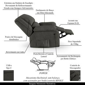 Que tal criar seu próprio home cinema? Aqui, vamos mostrar como você pode montar o seu! Com o local adequado, alguns itens decorativos e uma poltrona ideal, você garantirá um espaço confortável e imersivo. O primeiro passo é investir em equipamentos de alta qualidade! Olha só que lindeza a nossa Poltrona do Papai Reclinável Melim. Ela foi projetada para proporcionar máximo conforto e funcionalidade, esta poltrona é a escolha ideal para quem busca relaxamento, estilo e uma experiência de cinema privada. A praticidade do ajuste elétrico conta com acionamento de reclinagem por botão power elétrico Bivolt em uma das Braças, com apenas um toque, proporcionando a posição ideal, criando uma experiência incomparável. A presença do botão elétrico e do controle de massagem eleva o nível de relaxamento, proporcionando uma experiência cinematográfica aliada aos benefícios terapêuticos de uma massagem. Com capacidade para suportar até 130 kg, oferecendo segurança e estabilidade ao consumidor. O revestimento em Linho Grafite oferece um toque de sofisticação e conforto, enquanto a estrutura em Madeira de Lei Eucalipto com Controle de Umidade, Proveniente de Reflorestamento, Fixa com Grampos Galvanizados garante resistência e durabilidade. O encosto e o assento são sustentados por percintas elásticas. O braço/assento possui Enchimento em Fibra Siliconada. O assento foi preenchido com espuma D-28, respectivamente, para um conforto adicional. O assento (fixo) e o apoio de Pés Retrátil proporcionam um apoio perfeito para suas pernas, aumentando o conforto. O encosto reclinável, possibilita ajustá- lo para a posição ideal de relaxamento. Já os pés (fixos) foram feitos em aço revestido com plástico, adicionando um toque de elegância ao produto. E tem mais!! A poltrona também possui uma saída USB, que permite que você carregue seu celular ou tablet enquanto você relaxa. Ela contém Bolso lateral nas braças perfeito para armazenar livros e revistas, mantendo tudo ao seu alcance. Com um design moderno e prático, esta poltrona se tornará o destaque da sua sala de estar. Afinal, sua casa merece a Poltrona do Papai Reclinável Melim Power Elétrica Massagem. Adquira a sua agora mesmo e transforme sua sala de estar em um verdadeiro cinema!