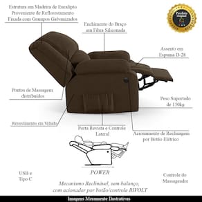 Que tal criar seu próprio home cinema? Aqui, vamos mostrar como você pode montar o seu! Com o local adequado, alguns itens decorativos e uma poltrona ideal, você garantirá um espaço confortável e imersivo. O primeiro passo é investir em equipamentos de alta qualidade! Olha só que lindeza a nossa Poltrona do Papai Reclinável Melim. Ela foi projetada para proporcionar máximo conforto e funcionalidade, esta poltrona é a escolha ideal para quem busca relaxamento, estilo e uma experiência de cinema privada. A praticidade do ajuste elétrico conta com acionamento de reclinagem por botão power elétrico Bivolt em uma das Braças, com apenas um toque, proporcionando a posição ideal, criando uma experiência incomparável. A presença do botão elétrico e do controle de massagem eleva o nível de relaxamento, proporcionando uma experiência cinematográfica aliada aos benefícios terapêuticos de uma massagem. Com capacidade para suportar até 130 kg, oferecendo segurança e estabilidade ao consumidor. O revestimento em Veludo Marrom oferece um toque de sofisticação e conforto, enquanto a estrutura em Madeira de Lei Eucalipto com Controle de Umidade, Proveniente de Reflorestamento, Fixa com Grampos Galvanizados garante resistência e durabilidade. O encosto e o assento são sustentados por percintas elásticas. O braço/assento possui Enchimento em Fibra Siliconada. O assento foi preenchido com espuma D-28, respectivamente, para um conforto adicional. O assento (fixo) e o apoio de Pés Retrátil proporcionam um apoio perfeito para suas pernas, aumentando o conforto. O encosto reclinável, possibilita ajustá- lo para a posição ideal de relaxamento. Já os pés (fixos) foram feitos em aço revestido com plástico, adicionando um toque de elegância ao produto. E tem mais!! A poltrona também possui uma saída USB, que permite que você carregue seu celular ou tablet enquanto você relaxa. Ela contém Bolso lateral nas braças perfeito para armazenar livros e revistas, mantendo tudo ao seu alcance. Com um design moderno e prático, esta poltrona se tornará o destaque da sua sala de estar. Afinal, sua casa merece a Poltrona do Papai Reclinável Melim Power Elétrica Massagem. Adquira a sua agora mesmo e transforme sua sala de estar em um verdadeiro cinema!