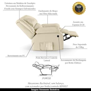 Que tal criar seu próprio home cinema? Aqui, vamos mostrar como você pode montar o seu! Com o local adequado, alguns itens decorativos e uma poltrona ideal, você garantirá um espaço confortável e imersivo. O primeiro passo é investir em equipamentos de alta qualidade! Olha só que lindeza a nossa Poltrona do Papai Reclinável Melim. Ela foi projetada para proporcionar máximo conforto e funcionalidade, esta poltrona é a escolha ideal para quem busca relaxamento, estilo e uma experiência de cinema privada. A praticidade do ajuste elétrico conta com acionamento de reclinagem por botão power elétrico Bivolt em uma das Braças, com apenas um toque, proporcionando a posição ideal, criando uma experiência incomparável. Com capacidade para suportar até 130 kg, oferecendo segurança e estabilidade ao consumidor. O revestimento em PU Bege oferece um toque de sofisticação e conforto, enquanto a estrutura em Madeira de Lei Eucalipto com Controle de Umidade, Proveniente de Reflorestamento, Fixa com Grampos Galvanizados garante resistência e durabilidade. O encosto e o assento são sustentados por percintas elásticas. O braço/assento possui Enchimento em Fibra Siliconada. O assento foi preenchido com espuma D-28, respectivamente, para um conforto adicional. O assento (fixo) e o apoio de Pés Retrátil proporcionam um apoio perfeito para suas pernas, aumentando o conforto. O encosto reclinável, possibilita ajustá- lo para a posição ideal de relaxamento. Já os pés (fixos) foram feitos em aço revestido com plástico, adicionando um toque de elegância ao produto. E tem mais!! Ela contém Bolso lateral nas braças perfeito para armazenar livros e revistas, mantendo tudo ao seu alcance. Com um design moderno e prático, esta poltrona se tornará o destaque da sua sala de estar. Afinal, sua casa merece a Poltrona do Papai Reclinável Melim Power Elétrica. Adquira a sua agora mesmo e transforme sua sala de estar em um verdadeiro cinema!