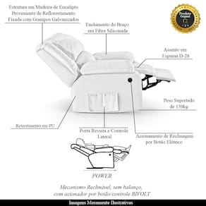 Que tal criar seu próprio home cinema? Aqui, vamos mostrar como você pode montar o seu! Com o local adequado, alguns itens decorativos e uma poltrona ideal, você garantirá um espaço confortável e imersivo. O primeiro passo é investir em equipamentos de alta qualidade! Olha só que lindeza a nossa Poltrona do Papai Reclinável Melim. Ela foi projetada para proporcionar máximo conforto e funcionalidade, esta poltrona é a escolha ideal para quem busca relaxamento, estilo e uma experiência de cinema privada. A praticidade do ajuste elétrico conta com acionamento de reclinagem por botão power elétrico Bivolt em uma das Braças, com apenas um toque, proporcionando a posição ideal, criando uma experiência incomparável. Com capacidade para suportar até 130 kg, oferecendo segurança e estabilidade ao consumidor. O revestimento em PU oferece um toque de sofisticação e conforto, enquanto a estrutura em Madeira de Lei Eucalipto com Controle de Umidade, Proveniente de Reflorestamento, Fixa com Grampos Galvanizados garante resistência e durabilidade. O encosto e o assento são sustentados por percintas elásticas. O braço/assento possui Enchimento em Fibra Siliconada. O assento foi preenchido com espuma D-28, respectivamente, para um conforto adicional. O assento (fixo) e o apoio de Pés Retrátil proporcionam um apoio perfeito para suas pernas, aumentando o conforto. O encosto reclinável, possibilita ajustá- lo para a posição ideal de relaxamento. Já os pés (fixos) foram feitos em aço revestido com plástico, adicionando um toque de elegância ao produto. E tem mais!! Ela contém Bolso lateral nas braças perfeito para armazenar livros e revistas, mantendo tudo ao seu alcance. Com um design moderno e prático, esta poltrona se tornará o destaque da sua sala de estar. Afinal, sua casa merece a Poltrona do Papai Reclinável Melim Power Elétrica. Adquira a sua agora mesmo e transforme sua sala de estar em um verdadeiro cinema!