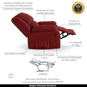 Que tal criar seu próprio home cinema? Aqui, vamos mostrar como você pode montar o seu! Com o local adequado, alguns itens decorativos e uma poltrona ideal, você garantirá um espaço confortável e imersivo. O primeiro passo é investir em equipamentos de alta qualidade! Olha só que lindeza a nossa Poltrona do Papai Reclinável Melim. Ela foi projetada para proporcionar máximo conforto e funcionalidade, esta poltrona é a escolha ideal para quem busca relaxamento, estilo e uma experiência de cinema privada. A praticidade do ajuste elétrico conta com acionamento de reclinagem por botão power elétrico Bivolt em uma das Braças, com apenas um toque, proporcionando a posição ideal, criando uma experiência incomparável. Com capacidade para suportar até 130 kg, oferecendo segurança e estabilidade ao consumidor. O revestimento em Veludo Vermelho oferece um toque de sofisticação e conforto, enquanto a estrutura em Madeira de Lei Eucalipto com Controle de Umidade, Proveniente de Reflorestamento, Fixa com Grampos Galvanizados garante resistência e durabilidade. O encosto e o assento são sustentados por percintas elásticas. O braço/assento possui Enchimento em Fibra Siliconada. O assento foi preenchido com espuma D-28, respectivamente, para um conforto adicional. O assento (fixo) e o apoio de Pés Retrátil proporcionam um apoio perfeito para suas pernas, aumentando o conforto. O encosto reclinável, possibilita ajustá- lo para a posição ideal de relaxamento. Já os pés (fixos) foram feitos em aço revestido com plástico, adicionando um toque de elegância ao produto. E tem mais!! A poltrona também possui uma saída USB, que permite que você carregue seu celular ou tablet enquanto você relaxa. Ela contém Bolso lateral nas braças perfeito para armazenar livros e revistas, mantendo tudo ao seu alcance. Com um design moderno e prático, esta poltrona se tornará o destaque da sua sala de estar. Afinal, sua casa merece a Poltrona do Papai Reclinável Melim Power Elétrica USB. Adquira a sua agora mesmo e transforme sua sala de estar em um verdadeiro cinema!