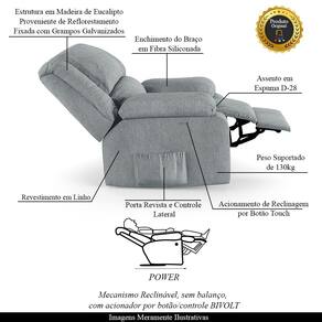 Que tal criar seu próprio home cinema? Aqui, vamos mostrar como você pode montar o seu! Com o local adequado, alguns itens decorativos e uma poltrona ideal, você garantirá um espaço confortável e imersivo. O primeiro passo é investir em equipamentos de alta qualidade! Olha só que lindeza a nossa Poltrona do Papai Reclinável Melim. Ela foi projetada para proporcionar máximo conforto e funcionalidade, esta poltrona é a escolha ideal para quem busca relaxamento, estilo e uma experiência de cinema privada. Com a conveniência do ajuste elétrico por meio de um Power botão touch Bivolt, é possível encontrar a posição ideal com um simples toque, proporcionando uma experiência imersiva única e sem comparações. Ela conta com capacidade para suportar até 130 kg, oferecendo segurança e estabilidade ao consumidor. O revestimento em Linho Cinza oferece um toque de sofisticação e conforto, enquanto a estrutura em Madeira de Lei Eucalipto com Controle de Umidade, Proveniente de Reflorestamento, Fixa com Grampos Galvanizados garante resistência e durabilidade. O braço Braço foi preenchido em Fibra Siliconada e assento/encosto foi preenchido com espuma D-28, respectivamente, para um conforto adicional. O assento (fixo) e o apoio de Pés Retrátil proporcionam um apoio perfeito para suas pernas, aumentando o conforto. O encosto reclinável, possibilita ajustá- lo para a posição ideal de relaxamento. Já os pés fixos foram feitos em aço revestido com plástico, adicionando um toque de elegância ao produto. E tem mais!! Ela contém Bolso lateral para revistas e controle nas braças perfeito para armazenar livros e outros objetos, mantendo tudo ao seu alcance. Com um design moderno e prático, esta poltrona se tornará o destaque da sua sala de estar. Afinal, sua casa merece a Poltrona do Papai Reclinável Melim Power Touch. Adquira a sua agora mesmo e transforme sua sala de estar em um verdadeiro cinema!