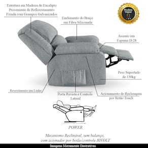 Que tal criar seu próprio home cinema? Aqui, vamos mostrar como você pode montar o seu! Com o local adequado, alguns itens decorativos e uma poltrona ideal, você garantirá um espaço confortável e imersivo. O primeiro passo é investir em equipamentos de alta qualidade! Olha só que lindeza a nossa Poltrona do Papai Reclinável Melim. Ela foi projetada para proporcionar máximo conforto e funcionalidade, esta poltrona é a escolha ideal para quem busca relaxamento, estilo e uma experiência de cinema privada. Com a conveniência do ajuste elétrico por meio de um Power botão touch Bivolt, é possível encontrar a posição ideal com um simples toque, proporcionando uma experiência imersiva única e sem comparações. Ela conta com capacidade para suportar até 130 kg, oferecendo segurança e estabilidade ao consumidor. O revestimento em Linho oferece um toque de sofisticação e conforto, enquanto a estrutura em Madeira de Lei Eucalipto com Controle de Umidade, Proveniente de Reflorestamento, Fixa com Grampos Galvanizados garante resistência e durabilidade. O braço Braço foi preenchido em Fibra Siliconada e assento/encosto foi preenchido com espuma D-28, respectivamente, para um conforto adicional. O assento (fixo) e o apoio de Pés Retrátil proporcionam um apoio perfeito para suas pernas, aumentando o conforto. O encosto reclinável, possibilita ajustá- lo para a posição ideal de relaxamento. Já os pés fixos foram feitos em aço revestido com plástico, adicionando um toque de elegância ao produto. E tem mais!! Ela contém Bolso lateral para revistas e controle nas braças perfeito para armazenar livros e outros objetos, mantendo tudo ao seu alcance. Com um design moderno e prático, esta poltrona se tornará o destaque da sua sala de estar. Afinal, sua casa merece a Poltrona do Papai Reclinável Melim Power Touch. Adquira a sua agora mesmo e transforme sua sala de estar em um verdadeiro cinema!