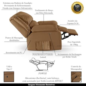 Que tal criar seu próprio home cinema? Aqui, vamos mostrar como você pode montar o seu! Com o local adequado, alguns itens decorativos e uma poltrona ideal, você garantirá um espaço confortável e imersivo. O primeiro passo é investir em equipamentos de alta qualidade! Olha só que lindeza a nossa Poltrona do Papai Reclinável Melim. Ela foi projetada para proporcionar máximo conforto e funcionalidade, esta poltrona é a escolha ideal para quem busca relaxamento, estilo e uma experiência de cinema privada. Com a conveniência do ajuste elétrico por meio de um Power botão touch Bivolt em uma das Braças, é possível encontrar a posição ideal com um simples toque, proporcionando uma experiência imersiva única e sem comparações. A presença do botão elétrico e do controle de massagem eleva o nível de relaxamento, proporcionando uma experiência cinematográfica aliada aos benefícios terapêuticos de uma massagem. Contém também uma saída USB, que permite que você carregue seu celular enquanto relaxa. Ela conta com capacidade para suportar até 130 kg, oferecendo segurança e estabilidade ao consumidor. O revestimento em Sintético PU oferece um toque de sofisticação e conforto, enquanto a estrutura em Madeira de Lei Eucalipto com Controle de Umidade, Proveniente de Reflorestamento, Fixa com Grampos Galvanizados garante resistência e durabilidade. O braço Braço foi preenchido em Fibra Siliconada e assento/encosto foi preenchido com espuma D-28, respectivamente, para um conforto adicional. O assento (fixo) e o apoio de Pés Retrátil proporcionam um apoio perfeito para suas pernas, aumentando o conforto. O encosto reclinável, possibilita ajustá- lo para a posição ideal de relaxamento. Já os pés fixos foram feitos em aço revestido com plástico, adicionando um toque de elegância ao produto. E tem mais!! Ela contém Bolso lateral para revistas e controle nas braças perfeito para armazenar livros e outros objetos, mantendo tudo ao seu alcance. Com um design moderno e prático, esta poltrona se tornará o destaque da sua sala de estar. Afinal, sua casa merece a Poltrona do Papai Reclinável Melim Power Touch Massagem. Adquira a sua agora mesmo e transforme sua sala de estar em um verdadeiro cinema!