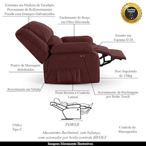 Que tal criar seu próprio home cinema? Aqui, vamos mostrar como você pode montar o seu! Com o local adequado, alguns itens decorativos e uma poltrona ideal, você garantirá um espaço confortável e imersivo. O primeiro passo é investir em equipamentos de alta qualidade! Olha só que lindeza a nossa Poltrona do Papai Reclinável Melim. Ela foi projetada para proporcionar máximo conforto e funcionalidade, esta poltrona é a escolha ideal para quem busca relaxamento, estilo e uma experiência de cinema privada. Com a conveniência do ajuste elétrico por meio de um Power botão touch Bivolt em uma das Braças, é possível encontrar a posição ideal com um simples toque, proporcionando uma experiência imersiva única e sem comparações. A presença do botão elétrico e do controle de massagem eleva o nível de relaxamento, proporcionando uma experiência cinematográfica aliada aos benefícios terapêuticos de uma massagem. Contém também uma saída USB, que permite que você carregue seu celular enquanto relaxa. Ela conta com capacidade para suportar até 130 kg, oferecendo segurança e estabilidade ao consumidor. O revestimento em Veludo oferece um toque de sofisticação e conforto, enquanto a estrutura em Madeira de Lei Eucalipto com Controle de Umidade, Proveniente de Reflorestamento, Fixa com Grampos Galvanizados garante resistência e durabilidade. O braço Braço foi preenchido em Fibra Siliconada e assento/encosto foi preenchido com espuma D-28, respectivamente, para um conforto adicional. O assento (fixo) e o apoio de Pés Retrátil proporcionam um apoio perfeito para suas pernas, aumentando o conforto. O encosto reclinável, possibilita ajustá- lo para a posição ideal de relaxamento. Já os pés fixos foram feitos em aço revestido com plástico, adicionando um toque de elegância ao produto. E tem mais!! Ela contém Bolso lateral para revistas e controle nas braças perfeito para armazenar livros e outros objetos, mantendo tudo ao seu alcance. Com um design moderno e prático, esta poltrona se tornará o destaque da sua sala de estar. Afinal, sua casa merece a Poltrona do Papai Reclinável Melim Power Touch Massagem. Adquira a sua agora mesmo e transforme sua sala de estar em um verdadeiro cinema!