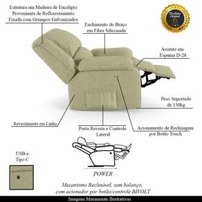 Que tal criar seu próprio home cinema? Aqui, vamos mostrar como você pode montar o seu! Com o local adequado, alguns itens decorativos e uma poltrona ideal, você garantirá um espaço confortável e imersivo. O primeiro passo é investir em equipamentos de alta qualidade! Olha só que lindeza a nossa Poltrona do Papai Reclinável Melim. Ela foi projetada para proporcionar máximo conforto e funcionalidade, esta poltrona é a escolha ideal para quem busca relaxamento, estilo e uma experiência de cinema privada. Com a conveniência do ajuste elétrico por meio de um Power botão touch Bivolt em uma das Braças, é possível encontrar a posição ideal com um simples toque, proporcionando uma experiência imersiva única e sem comparações. Contém também uma saída USB, que permite que você carregue seu celular enquanto relaxa. Ela conta com capacidade para suportar até 130 kg, oferecendo segurança e estabilidade ao consumidor. O revestimento em Linho Bege oferece um toque de sofisticação e conforto, enquanto a estrutura em Madeira de Lei Eucalipto com Controle de Umidade, Proveniente de Reflorestamento, Fixa com Grampos Galvanizados garante resistência e durabilidade. O braço Braço foi preenchido em Fibra Siliconada e assento/encosto foi preenchido com espuma D-28, respectivamente, para um conforto adicional. O assento (fixo) e o apoio de Pés Retrátil proporcionam um apoio perfeito para suas pernas, aumentando o conforto. O encosto reclinável, possibilita ajustá- lo para a posição ideal de relaxamento. Já os pés fixos foram feitos em aço revestido com plástico, adicionando um toque de elegância ao produto. E tem mais!! Ela contém Bolso lateral para revistas e controle nas braças perfeito para armazenar livros e outros objetos, mantendo tudo ao seu alcance. Com um design moderno e prático, esta poltrona se tornará o destaque da sua sala de estar. Afinal, sua casa merece a Poltrona do Poltrona do Papai Reclinável Melim Power Touch USB. Adquira a sua agora mesmo e transforme sua sala de estar em um verdadeiro cinema!