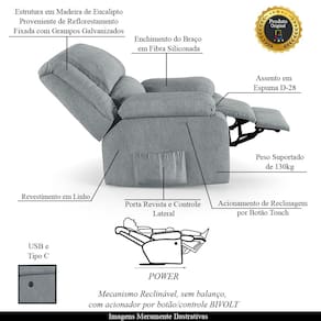 Que tal criar seu próprio home cinema? Aqui, vamos mostrar como você pode montar o seu! Com o local adequado, alguns itens decorativos e uma poltrona ideal, você garantirá um espaço confortável e imersivo. O primeiro passo é investir em equipamentos de alta qualidade! Olha só que lindeza a nossa Poltrona do Papai Reclinável Melim. Ela foi projetada para proporcionar máximo conforto e funcionalidade, esta poltrona é a escolha ideal para quem busca relaxamento, estilo e uma experiência de cinema privada. Com a conveniência do ajuste elétrico por meio de um Power botão touch Bivolt em uma das Braças, é possível encontrar a posição ideal com um simples toque, proporcionando uma experiência imersiva única e sem comparações. Contém também uma saída USB, que permite que você carregue seu celular enquanto relaxa. Ela conta com capacidade para suportar até 130 kg, oferecendo segurança e estabilidade ao consumidor. O revestimento em Linho Cinza oferece um toque de sofisticação e conforto, enquanto a estrutura em Madeira de Lei Eucalipto com Controle de Umidade, Proveniente de Reflorestamento, Fixa com Grampos Galvanizados garante resistência e durabilidade. O braço Braço foi preenchido em Fibra Siliconada e assento/encosto foi preenchido com espuma D-28, respectivamente, para um conforto adicional. O assento (fixo) e o apoio de Pés Retrátil proporcionam um apoio perfeito para suas pernas, aumentando o conforto. O encosto reclinável, possibilita ajustá- lo para a posição ideal de relaxamento. Já os pés fixos foram feitos em aço revestido com plástico, adicionando um toque de elegância ao produto. E tem mais!! Ela contém Bolso lateral para revistas e controle nas braças perfeito para armazenar livros e outros objetos, mantendo tudo ao seu alcance. Com um design moderno e prático, esta poltrona se tornará o destaque da sua sala de estar. Afinal, sua casa merece a Poltrona do Poltrona do Papai Reclinável Melim Power Touch USB. Adquira a sua agora mesmo e transforme sua sala de estar em um verdadeiro cinema!