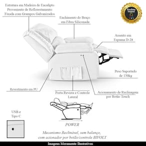 Que tal criar seu próprio home cinema? Aqui, vamos mostrar como você pode montar o seu! Com o local adequado, alguns itens decorativos e uma poltrona ideal, você garantirá um espaço confortável e imersivo. O primeiro passo é investir em equipamentos de alta qualidade! Olha só que lindeza a nossa Poltrona do Papai Reclinável Melim. Ela foi projetada para proporcionar máximo conforto e funcionalidade, esta poltrona é a escolha ideal para quem busca relaxamento, estilo e uma experiência de cinema privada. Com a conveniência do ajuste elétrico por meio de um Power botão touch Bivolt em uma das Braças, é possível encontrar a posição ideal com um simples toque, proporcionando uma experiência imersiva única e sem comparações. Contém também uma saída USB, que permite que você carregue seu celular enquanto relaxa. Ela conta com capacidade para suportar até 130 kg, oferecendo segurança e estabilidade ao consumidor. O revestimento em Sintético PU Branco oferece um toque de sofisticação e conforto, enquanto a estrutura em Madeira de Lei Eucalipto com Controle de Umidade, Proveniente de Reflorestamento, Fixa com Grampos Galvanizados garante resistência e durabilidade. O braço Braço foi preenchido em Fibra Siliconada e assento/encosto foi preenchido com espuma D-28, respectivamente, para um conforto adicional. O assento (fixo) e o apoio de Pés Retrátil proporcionam um apoio perfeito para suas pernas, aumentando o conforto. O encosto reclinável, possibilita ajustá- lo para a posição ideal de relaxamento. Já os pés fixos foram feitos em aço revestido com plástico, adicionando um toque de elegância ao produto. E tem mais!! Ela contém Bolso lateral para revistas e controle nas braças perfeito para armazenar livros e outros objetos, mantendo tudo ao seu alcance. Com um design moderno e prático, esta poltrona se tornará o destaque da sua sala de estar. Afinal, sua casa merece a Poltrona do Poltrona do Papai Reclinável Melim Power Touch USB. Adquira a sua agora mesmo e transforme sua sala de estar em um verdadeiro cinema!