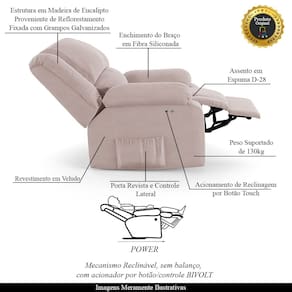Que tal criar seu próprio home cinema? Aqui, vamos mostrar como você pode montar o seu! Com o local adequado, alguns itens decorativos e uma poltrona ideal, você garantirá um espaço confortável e imersivo. O primeiro passo é investir em equipamentos de alta qualidade! Olha só que lindeza a nossa Poltrona do Papai Reclinável Melim. Ela foi projetada para proporcionar máximo conforto e funcionalidade, esta poltrona é a escolha ideal para quem busca relaxamento, estilo e uma experiência de cinema privada. Com a conveniência do ajuste elétrico por meio de um Power botão touch Bivolt, é possível encontrar a posição ideal com um simples toque, proporcionando uma experiência imersiva única e sem comparações. Ela conta com capacidade para suportar até 130 kg, oferecendo segurança e estabilidade ao consumidor. O revestimento em Veludo Rosê oferece um toque de sofisticação e conforto, enquanto a estrutura em Madeira de Lei Eucalipto com Controle de Umidade, Proveniente de Reflorestamento, Fixa com Grampos Galvanizados garante resistência e durabilidade. O braço Braço foi preenchido em Fibra Siliconada e assento/encosto foi preenchido com espuma D-28, respectivamente, para um conforto adicional. O assento (fixo) e o apoio de Pés Retrátil proporcionam um apoio perfeito para suas pernas, aumentando o conforto. O encosto reclinável, possibilita ajustá- lo para a posição ideal de relaxamento. Já os pés fixos foram feitos em aço revestido com plástico, adicionando um toque de elegância ao produto. E tem mais!! Ela contém Bolso lateral para revistas e controle nas braças perfeito para armazenar livros e outros objetos, mantendo tudo ao seu alcance. Com um design moderno e prático, esta poltrona se tornará o destaque da sua sala de estar. Afinal, sua casa merece a Poltrona do Papai Reclinável Melim Power Touch. Adquira a sua agora mesmo e transforme sua sala de estar em um verdadeiro cinema!