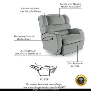 Que tal criar seu próprio home cinema? Aqui, vamos mostrar como você pode montar o seu! Com o local adequado, alguns itens decorativos e uma poltrona ideal, você garantirá um espaço confortável e imersivo. O primeiro passo é investir em equipamentos de alta qualidade! Olha só que lindeza a nossa Poltrona Reclinável do Papai Napoli. Ela foi projetada para proporcionar máximo conforto e funcionalidade, esta poltrona é a escolha ideal para quem busca relaxamento, estilo e uma experiência de cinema privada. Com capacidade para suportar até 110 kg oferecendo segurança e estabilidade ao consumidor. O revestimento em Sintético PU Cinza oferece um toque de sofisticação e conforto, enquanto a estrutura em Madeira Maciça de Eucalipto garante resistência e durabilidade. O sistema de abertura fácil permite ajustar a poltrona sem esforço: basta acionar o mecanismo power com controle de acionamento Bi-volt, onde possibilita que você encontre a posição perfeita com um simples toque de um botão. O encosto e o assento são sustentados por fibra siliconada e espuma D-28, no assento também possui Molas respectivamente para um conforto adicional. O assento (fixo) e o apoio de Pés Retrátil proporcionam um apoio perfeito para suas pernas, aumentando o conforto. O encosto reclinável, possibilita ajustá- lo para a posição ideal de relaxamento. Já os pés (fixos) foram feitos em madeira e revestidos em alumínio cromado, adicionando um toque de elegância ao produto. Com um design moderno e prático, esta poltrona se tornará o destaque da sua sala de estar. Afinal, sua casa merece a Poltrona do Papai Reclinável Napoli Controle Power Elétrico. Adquira a sua agora mesmo e transforme sua sala de estar em um verdadeiro cinema!