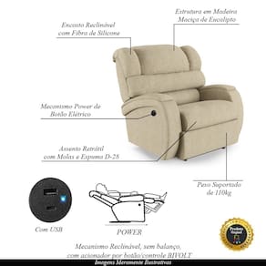 Que tal criar seu próprio home cinema? Aqui, vamos mostrar como você pode montar o seu! Com o local adequado, alguns itens decorativos e uma poltrona ideal, você garantirá um espaço confortável e imersivo. O primeiro passo é investir em equipamentos de alta qualidade! Olha só que lindeza a nossa Poltrona Reclinável do Papai Napoli. Ela foi projetada para proporcionar máximo conforto e funcionalidade, esta poltrona é a escolha ideal para quem busca relaxamento, estilo e uma experiência de cinema privada. Com capacidade para suportar até 110 kg oferecendo segurança e estabilidade ao consumidor. O revestimento em Linho Bege oferece um toque de sofisticação e conforto, enquanto a estrutura em Madeira Maciça de Eucalipto garante resistência e durabilidade. O sistema de abertura fácil permite ajustar a poltrona sem esforço: basta acionar o mecanismo power com controle de acionamento bivolt, onde possibilita que você encontre a posição perfeita com um simples toque de um botão LED. E tem mais, ela ainda conta com entrada USB e tipo C ideal para carregar seus eletrônicos enquanto descansa. O encosto e o assento são sustentados por fibra siliconada e espuma D-28, no assento também possui Molas respectivamente para um conforto adicional. O assento (fixo) e o apoio de Pés Retrátil proporcionam um apoio perfeito para suas pernas, aumentando o conforto. O encosto reclinável, possibilita ajustá- lo para a posição ideal de relaxamento. Já os pés (fixos) foram feitos em Aço Revestido com Plástico, adicionando um toque de elegância ao produto. Com um design moderno e prático, esta poltrona se tornará o destaque da sua sala de estar. Afinal, sua casa merece a Poltrona do Papai Reclinável Napoli Controle Power Elétrico USB. Adquira a sua agora mesmo e transforme sua sala de estar em um verdadeiro cinema!