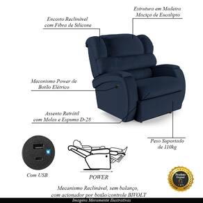 Que tal criar seu próprio home cinema? Aqui, vamos mostrar como você pode montar o seu! Com o local adequado, alguns itens decorativos e uma poltrona ideal, você garantirá um espaço confortável e imersivo. O primeiro passo é investir em equipamentos de alta qualidade! Olha só que lindeza a nossa Poltrona Reclinável do Papai Napoli. Ela foi projetada para proporcionar máximo conforto e funcionalidade, esta poltrona é a escolha ideal para quem busca relaxamento, estilo e uma experiência de cinema privada. Com capacidade para suportar até 110 kg oferecendo segurança e estabilidade ao consumidor. O revestimento em PU Azul oferece um toque de sofisticação e conforto, enquanto a estrutura em Madeira Maciça de Eucalipto garante resistência e durabilidade. O sistema de abertura fácil permite ajustar a poltrona sem esforço: basta acionar o mecanismo power com controle de acionamento bivolt, onde possibilita que você encontre a posição perfeita com um simples toque de um botão LED. E tem mais, ela ainda conta com entrada USB e tipo C ideal para carregar seus eletrônicos enquanto descansa. O encosto e o assento são sustentados por fibra siliconada e espuma D-28, no assento também possui Molas respectivamente para um conforto adicional. O assento (fixo) e o apoio de Pés Retrátil proporcionam um apoio perfeito para suas pernas, aumentando o conforto. O encosto reclinável, possibilita ajustá- lo para a posição ideal de relaxamento. Já os pés (fixos) foram feitos em Aço Revestido com Plástico, adicionando um toque de elegância ao produto. Com um design moderno e prático, esta poltrona se tornará o destaque da sua sala de estar. Afinal, sua casa merece a Poltrona do Papai Reclinável Napoli Controle Power Elétrico USB. Adquira a sua agora mesmo e transforme sua sala de estar em um verdadeiro cinema!
