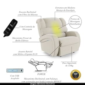 Diferenciais: Poltrona Elétrica com Massagem, Apoio de pés retrátil, botão LED para acionamento