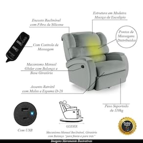 Diferenciais: Poltrona giratória e balanço, apoio de pés retrátil, gatilho lateral para acionar regulagem, acompanha controle para ativar massagem
