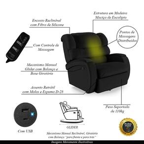 Diferenciais: Poltrona giratória e balanço, apoio de pés retrátil, gatilho lateral para acionar regulagem, acompanha controle para ativar massagem