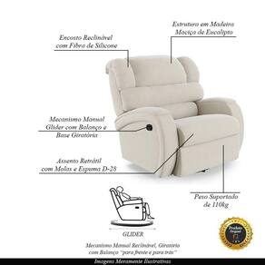 Que tal criar seu próprio home cinema? Aqui, vamos mostrar como você pode montar o seu! Com o local adequado, alguns itens decorativos e uma poltrona ideal, você garantirá um espaço confortável e imersivo. O iro passo é investir em equipamentos de alta qualidade! Olha só que lindeza a nossa Poltrona do Papai Reclinável Napoli. Ela foi projetada para proporcionar máximo conforto e funcionalidade, esta poltrona é a escolha ideal para quem busca relaxamento, estilo e uma experiência de cinema privada. A poltrona com sistema glider, encosto reclinável e apoio para os pés manual oferece um relaxamento total, sendo giratória e com balanço suave. Este ajuste é feito manualmente, utilizando um gatilho localizado na lateral da poltrona. Ao Veludoxar ou pressionar esse gatilho, o usuário pode reclinar o encosto ou levantar o apoio para os pés, ajustando a poltrona à posição desejada. Com capacidade para suportar até 110 kg, oferecendo segurança e estabilidade ao consumidor. O revestimento em Veludo oferece um toque de sofisticação e conforto, enquanto a estrutura em Madeira Maciça de Eucalipto. O assento foi preenchido com fibra siliconada e esVeludoma D-28, respectivamente, para um conforto adicional. O assento (fixo) e o apoio de Pés Retrátil proporcionam um apoio perfeito para suas pernas, aumentando o conforto. O encosto reclinável, possibilita ajustá- lo para a posição ideal de relaxamento. Já os pés giratórios foram feitos em aço revestido com plástico, adicionando um toque de elegância ao produto. Com um design moderno e prático, esta poltrona se tornará o destaque da sua sala de estar. Afinal, sua casa merece a Poltrona do Papai Reclinável Napoli Glider Giratória. Adquira a sua agora mesmo e transforme sua sala de estar em um verdadeiro cinema!