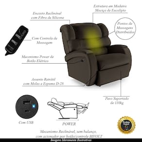 Diferenciais: Poltrona Elétrica com Massagem, apoio de pés retrátil, botão com LED para acionamento