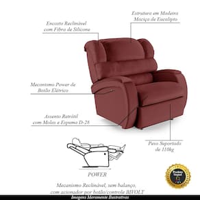 Que tal criar seu próprio home cinema? Aqui, vamos mostrar como você pode montar o seu! Com o local adequado, alguns itens decorativos e uma poltrona ideal, você garantirá um espaço confortável e imersivo. O primeiro passo é investir em equipamentos de alta qualidade! Olha só que lindeza a nossa Poltrona do Papai Reclinável Napoli. Ela foi projetada para proporcionar máximo conforto e funcionalidade, esta poltrona é a escolha ideal para quem busca relaxamento, estilo e uma experiência de cinema privada. A facilidade de ajuste com o botão elétrico com LED permite que você encontre a posição perfeita com o toque suave de um botão touch, pensado para proporcionar uma experiência imersiva sem igual. Ela conta com capacidade para suportar até 110 kg, oferecendo segurança e estabilidade ao consumidor. O revestimento em PU Vermelho oferece um toque de sofisticação e conforto, enquanto a estrutura em Composta por Madeira Maciça de Eucalipto garante resistência e durabilidade. O encosto foi preenchido com fibra siliconada. O assento foi preenchido com molas e espuma D-28, respectivamente, para um conforto adicional. O assento e o apoio de Pés Retrátil proporcionam um apoio perfeito para suas pernas, aumentando o conforto. Já os pés fixos foram feitos em aço revestido com plástico, adicionando um toque de elegância ao produto. Com um design moderno e prático, esta poltrona se tornará o destaque da sua sala de estar. Afinal, sua casa merece a Poltrona do Papai Reclinável Napoli Power Touch. Adquira a sua agora mesmo e transforme sua sala de estar em um verdadeiro cinema!