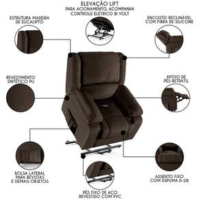 Altura: 100 cm | AssemblyRequired: Sim, sugerimos a contratação do nosso serviço de montagem (para os CEPs em que o serviço está dispon | Color: Marrom | ColorFamily: Marrom | ColorSimple: Marrom | ColorSupplier: Marrom | Cor: Marrom | Gênero: Unisex | Largura: 100 cm | Manual: Sim | Marca: Mpozenato | Material: Madeira de Eucalipto | MaterialFamily: Madeira de Eucalipto | Model: Pietra | Origem: | OriginCountry: | OriginState: PR | Peso: 62 kg | Peso Suportado: 130 Kg | ProductContents: 1 Poltrona | ProductHeight: 100 | ProductInstructions: Produto para uso em ambiente interno, nao devendo ficar exposto ao sol, calor e umidade excessivos. | ProductLength: 114 | ProductWarranty: 90 dias após o do produto | ProductWeight: 62 kg | ProductWidth: 100 | Profundidade: 114 cm | Requere montagem: Sim | SizeDescription: 100 x 100 x 114 cm | SupplierSimpleName: Poltrona do Papai Reclinável Pietra Elevação Lift Elétrico FH9 PU Marrom - Mpozenato | Tipo de Garantia: Fabricante