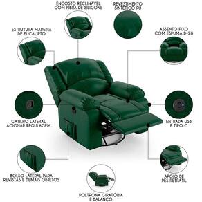 Que tal transformar a sua Sala De Estar em um espaço de entretenimento comparável a uma sala de cinema privada? A Poltrona do Papai Reclinável Pietra Glider Giratória USB FH9 PU Verde Musgo, da Mpozenato é a adição perfeita para alcançar esse sonho.