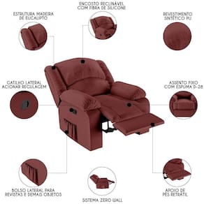 Altura: 100 cm | AssemblyRequired: Sim, sugerimos a contratação do nosso serviço de montagem (para os CEPs em que o serviço está dispon | Color: Vermelho | ColorFamily: Vermelho | ColorSimple: Vermelho | ColorSupplier: Vermelho | Cor: Vermelho | Gênero: Unisex | Largura: 100 cm | Manual: Sim | Marca: Mpozenato | Material: Madeira de Eucalipto | MaterialFamily: Madeira de Eucalipto | Model: Pietra | Origem: | OriginCountry: | OriginState: PR | Peso: 62 kg | Peso Suportado: 130 Kg | ProductContents: 1 Poltrona | ProductHeight: 100 | ProductInstructions: Produto para uso em ambiente interno, nao devendo ficar exposto ao sol, calor e umidade excessivos. | ProductLength: 114 | ProductWarranty: 90 dias após o do produto | ProductWeight: 62 kg | ProductWidth: 100 | Profundidade: 114 cm | Requere montagem: Sim | SizeDescription: 100 x 100 x 114 cm | SupplierSimpleName: Poltrona do Papai Reclinável Pietra Wall FH9 PU Vermelho - Mpozenato | Tipo de : Fabricante