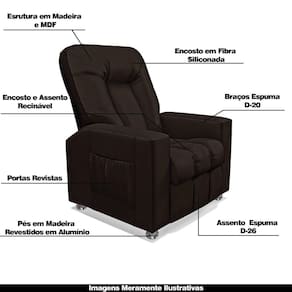 Profundidade Aberto: 148 cm Altura do Encosto: 70 cm Altura do Assento: 45 cm Largura do Assento: 52 cm Profundidade do assento: 50 cm Características: Estrutura em madeira de reflorestamento de eucalipto. Encosto reclinável com fibra siliconada e percintas elásticas. Assento reclinável com espuma D-26, soft e percintas elásticas. Braça com espuma D-20. Possui mecanismo de 02 estágios e 03 posições. Contém porta copo nas braças e revisteiro na lateral. Pés em madeira revestidos em alumínio. Revestimento em Facto na cor Marrom. Suporta 110 Kg por assento. - A tonalidade do produto real poderá ter ligeira variação devido o lote de tecidos. - A limpeza deve ser feita com pano levemente umedecido em água limpa, sem esfregar, não utilizar produtos abrasivos, desengordurantes, álcool ou solvente.. Observações importantes: - Produto para uso em ambiente interno, não devendo ficar exposto diretamente ao sol, calor e umidade excessivos. - Pode haver alguma diferença de tonalidade entre a imagem e o produto real, por conta do tratamento de imagens e a calibração de cores do seu monitor. - As imagens são meramente ilustrativas, não acompanham objetos de decoração e eletrônicos. - Ao receber a mercadoria, o cliente deve verificar as condições da embalagem, caso haja alguma não assine o de . - Montagem, desmontagem e outras instalações serão de responsabilidade do cliente. Não nos responsabilizamos, no ato da , por subir escadas/elevadores ou pelo por guincho em apartamentos. Eventuais despesas são de responsabilidade do comprador. - Confira as dimensões do produto e certifique-se de que passará normalmente por supostos elevadores, portas, escadas e/ou corredores de sua residência. ColorSimple: Marrom | ProductWeight: 42 kg | Peso máximo suportado: 110 kg | ProductWarranty: 90 dias após o do produto | Cor: Marrom | Peso: 42 Kg | Fabricante: Lyam Decor | ColorSupplier: Marrom | Material: Madeira de Eucalipto, Fibra siliconada, Percintas Elásticas. Espuma D-20 e D-26, Aluminio | Model: Romeo | Color: Marrom | Linha: Sala de Cinema | Estilo: Moderno | ColorFamily: Marrom | MaterialFamily: Madeira, Espuma, MDF | SupplierSimpleName: Poltrona do Papai Reclinável Romeo F05 Facto Marrom - Lyam Decor | Profundidade: 98 cm | Altura: 110 cm | ProductLength: 98 cm | OriginState: PR | ProductContents: 01 Poltrona | ProductHeight: 110 cm | Material do estofamento: Facto | Unidades por kit: 1 | Formato do sofá: Ergonômico | Material de enchimento do encosto: Fibra Siliconada | Densidade da espuma do assento: Espuma D-26 | Mecanismo de abertura do produto: Reclinável | Requer montagem: Não | Desenho do tecido: Liso | OriginCountry: | SizeDescription: Altura: 110 cm x Largura: 85 cm x Profundidade: 98 cm | ProductInstructions: Produto para uso em ambiente interno, nao devendo ficar exposto ao sol, calor e umidade excessivos. | ProductWidth: 85 cm | Largura: 85 cm | Tipo de produto: Poltrona