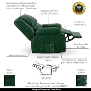 Poltrona do Papai Barcelona - Gran Belo Seja para assistir TV, ler um livro, até mesmo uma sala de cinema ou simplesmente relaxar. Com um design clássico e elegante, a poltrona também possui uma saída USB, que permite que você carregue seu celular ou tablet enquanto assiste ao seu filme favorito. Ela é bivolt, podendo ser usada em qualquer tomada. Além disso, ela tem um apoio para os pés, que se eleva junto com o encosto, proporcionando uma posição mais ergonômica e confortável, com braços largos e apoio para os pés após reclinar ela, oferecendo um conforto inigualável. Não perca essa chance de adquirir a poltrona do papai reclinável elétrica Barcelona da Gran Belo, uma peça única que vai trazer mais conforto e sofisticação para sua sala de cinema.