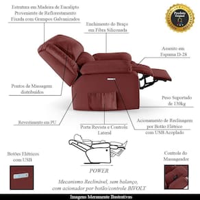 Poltrona do Papai Barcelona - Gran Belo Seja para assistir TV, ler um livro, até mesmo uma sala de cinema ou simplesmente relaxar. Com um design clássico e elegante, a poltrona também possui uma saída USB, que permite que você carregue seu celular ou tablet enquanto assiste ao seu filme favorito. Ela é bivolt, podendo ser usada em qualquer tomada. Além disso, ela tem um apoio para os pés, que se eleva junto com o encosto, proporcionando uma posição mais ergonômica e confortável, com braços largos e apoio para os pés após reclinar ela, oferecendo um conforto inigualável. Não perca essa chance de adquirir a poltrona do papai reclinável elétrica Barcelona da Gran Belo, uma peça única que vai trazer mais conforto e sofisticação para sua sala de cinema.