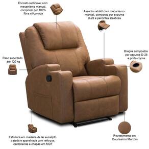 Cor: Marrom | Fabricante: Lyam Decor | Linha: Sala de Estar | Tipo de produto: Poltrona Retrátil Reclinável | Material do estofamento: Couríssimo | Unidades por kit: 1 | Orientação do Sofá: Frontal | Cor dos pés: Preto | Estilo: Moderno | Peso: 65 Kg | Formato do sofá: Linear | Material de enchimento do encosto: Fibra Siliconada | Densidade da espuma do assento: D-28 | Mecanismo de abertura do produto: Manual | Requer montagem: Não | Peso máximo suportado: 120 kg | Desenho do tecido: Liso | Quantidade de Caixas de embalagem: 1 | Altura: 105 cm | Profundidade: 104 cm | Largura: 89 cm
