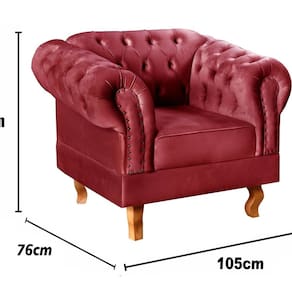 Não rasgue a embalagem antes de ter certeza que ficará com tudo. Acompanha Almofadas extras: Não Acompanha Puff: Não Almofada do assento: Removível Almofada do encosto: Não Possui Altura do assento até o chão: 41 cm Altura do Encosto: 82 cm Ambiente Principal: Sala de Estar Complexidade da Montagem: Baixa: pode ser montado por uma pessoa sozinha Cor: Bordô Cor do Produto: Bordô Design Assinado: Não Enchimento do Assento: Espuma D-26 Enchimento do Braço: Espuma D-26 Encosto para a Cabeça: Não Estampado: Não Extensível: Não Firmeza do Assento: Médio Informações Complementares: 120Kg por acento Itens Inclusos: 1 Poltrona Dom Pedro (incluindo seus respectivos pés apenas pra enroscar) Linha ou Coleção: Chesterfield Material do Braço: Madeira Eucalipto Material dos Pés: Madeira Eucalípto Modelo de Poltrona: Fixo Necessita Montagem: Sim Origem do Produto: Nacional Peso: 35 kg Possui Percintas Elásticas: Sim Possui Pés: 04 Possui Rodízio: Não Recomendações de Uso, Manutenção e Limpeza: Limpeza e cuidados: pode ser utilizado aspirador de pó, escova com cerdas macias ou limpeza a seco. Não utilizar produtos químicos, abrasivos ou limpeza a vapor. Evitar exposição prolongada ao sol. Sistema de Montagem: Enroscar os Pés Suporta Até (kg): 120 kg Tecido Predominante: Suede Tipo de Assento: Fixo Tipo de Encosto: Fixo Tipo de Espuma do Assento: Espuma Convencional Tipo de Poltrona: Decorativa