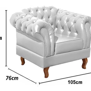 Não rasgue a embalagem antes de ter certeza que ficará com tudo. Acompanha Almofadas extras: Não Acompanha Puff: Não Almofada do assento: Removível Almofada do encosto: Não Possui Altura do assento até o chão: 41 cm Altura do Encosto: 82 cm Ambiente Principal: Sala de Estar Complexidade da Montagem: Baixa: pode ser montado por uma pessoa sozinha Cor: Branco Cor do Produto: Branco Design Assinado: Não Enchimento do Assento: Espuma D-26 Enchimento do Braço: Espuma D-26 Encosto para a Cabeça: Não Estampado: Não Extensível: Não Firmeza do Assento: Médio Informações Complementares: 120Kg por acento Itens Inclusos: 1 Poltrona Dom Pedro (incluindo seus respectivos pés apenas pra enroscar) Linha ou Coleção: Chesterfield Material do Braço: Madeira Eucalipto Material dos Pés: Madeira Eucalípto Modelo de Poltrona: Fixo Necessita Montagem: Sim Origem do Produto: Nacional Peso: 35 kg Possui Percintas Elásticas: Sim Possui Pés: 04 Possui Rodízio: Não Recomendações de Uso, Manutenção e Limpeza: Limpeza e cuidados: pode ser utilizado aspirador de pó, escova com cerdas macias ou limpeza a seco. Não utilizar produtos químicos, abrasivos ou limpeza a vapor. Evitar exposição prolongada ao sol. Sistema de Montagem: Enroscar os Pés Suporta Até (kg): 120 kg Tecido Predominante: Couro Sintético Tipo de Assento: Fixo Tipo de Encosto: Fixo Tipo de Espuma do Assento: Espuma Convencional Tipo de Poltrona: Decorativa