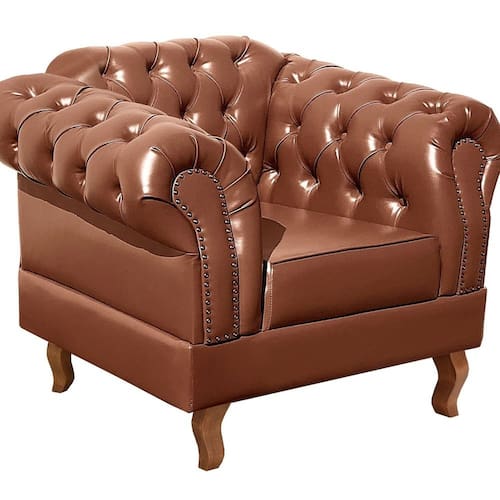 Não rasgue a embalagem antes de ter certeza que ficará com tudo. Acompanha Almofadas extras: Não Acompanha Puff: Não Almofada do assento: Removível Almofada do encosto: Não Possui Altura do assento até o chão: 41 cm Altura do Encosto: 82 cm Ambiente Principal: Sala de Estar Complexidade da Montagem: Baixa: pode ser montado por uma pessoa sozinha Cor: Caramelo Cor do Produto: Caramelo Design Assinado: Não Enchimento do Assento: Espuma D-26 Enchimento do Braço: Espuma D-26 Encosto para a Cabeça: Não Estampado: Não Extensível: Não Firmeza do Assento: Médio Informações Complementares: 120Kg por acento Itens Inclusos: 1 Poltrona Dom Pedro (incluindo seus respectivos pés apenas pra enroscar) Linha ou Coleção: Chesterfield Material do Braço: Madeira Eucalipto Material dos Pés: Madeira Eucalípto Modelo de Poltrona: Fixo Necessita Montagem: Sim Origem do Produto: Nacional Peso: 35 kg Possui Percintas Elásticas: Sim Possui Pés: 04 Possui Rodízio: Não Recomendações de Uso, Manutenção e Limpeza: Limpeza e cuidados: pode ser utilizado aspirador de pó, escova com cerdas macias ou limpeza a seco. Não utilizar produtos químicos, abrasivos ou limpeza a vapor. Evitar exposição prolongada ao sol. Sistema de Montagem: Enroscar os Pés Suporta Até (kg): 120 kg Tecido Predominante: Couro Sintético Tipo de Assento: Fixo Tipo de Encosto: Fixo Tipo de Espuma do Assento: Espuma Convencional Tipo de Poltrona: Decorativa