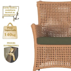 A corda nautica adiciona um toque de rusticidade moderna, enquanto o estofado impermeavel garante que sua poltrona esteja sempre impecavel, mesmo apos uma chuva inesperada ou um acidente com liquidos.