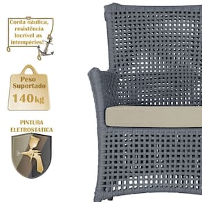 A corda nautica adiciona um toque de rusticidade moderna, enquanto o estofado impermeavel garante que sua poltrona esteja sempre impecavel, mesmo apos uma chuva inesperada ou um acidente com liquidos.