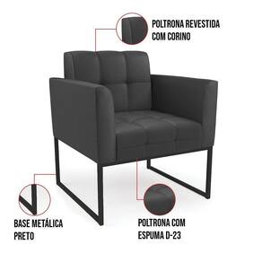 Você gosta de colecionar vários momentos memoráveis com sua família e amigos? Que tal recebê-los, com móveis de altíssima qualidade que só a DRossi tem? A Poltrona Elisa é adequada para você! Seu design retrô é a grande tendência do momento. Pode ser usada em diversos espaços da casa, em salas, hall de entrada, quartos, cozinhas, varanda, sacada, escritório, dentre outros. Contém as seguintes características: A estrutura é feita de madeira de Eucalipto 100% de reflorestamento, e a Base Metálica Industrial Preto, além de ser resistente e durável, suporta em média até 120 kg. Assento, encosto e braços, contém enchimento de espuma D-23 e é estofada em tecido Corino, no tom Preto, que oferece muito conforto e resistência ao sentar, com aquela sensação de maciez e aconchego. Possui também, detalhes de costura no encosto e assento, resultando em um acabamento impecável, conferindo muito mais valor e elegância ao seu espaço. Para complementar a decoração com essa linda poltrona, a dica é utilizar mantas, almofadas ou vasinho de flor. E pronto, seu cantinho estará perfeito para descansar e relaxar! Aqui, você encontra várias opções, para que seus amigos e familiares se sintam acolhidos. Garanta já sua Poltrona.