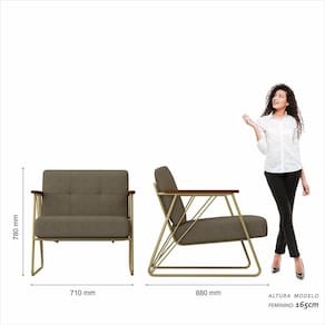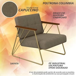 Detalhes Técnicos das Poltronas - Assento e Encosto Tapeçados, Estofados e Fixos - Espuma do Assento e do Encosto: D20 - Tonalidade Estrutura: Dourado - Tonalidade Estofado: Suede Capuccino - Material: Metalon - Medida Poltrona: A:78CM x L:71CM x P:88CM - Altura do assento ao chão:42CM - Poltrona suporta até 120KG