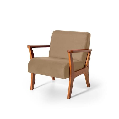 Suabase e braços são confeccionados em Madeira Maciça Lyptus Grandis, proveniente de reflorestamento, com acabamento em selador nogueira fosco. Seu assento e encosto são produzidos em tecidoSuede Veludo, dando umtoque suave e macio ao móvel, com espuma certificada densidade (D28) e percinta elástica, matérias-primas que garantem maiorresistência e durabilidade ao produto. Além de contar comsapatas plásticas, ideal para a proteção do piso contra riscos.
